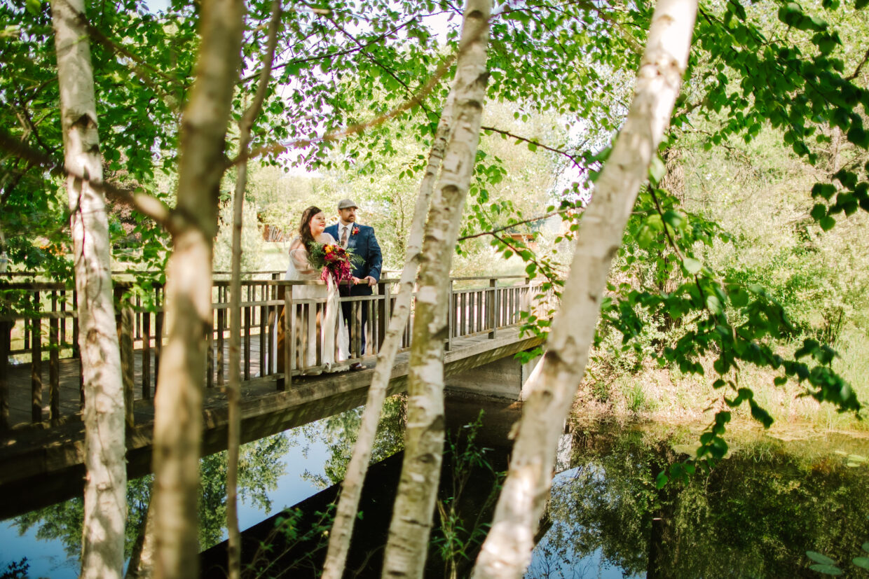 Central Wisconsin wedding venue near Wisconsin Dells at Caribou Bay Retreat – bride and groom standing on a wooden bridge surrounded by lush greenery holding a vibrant bouquet